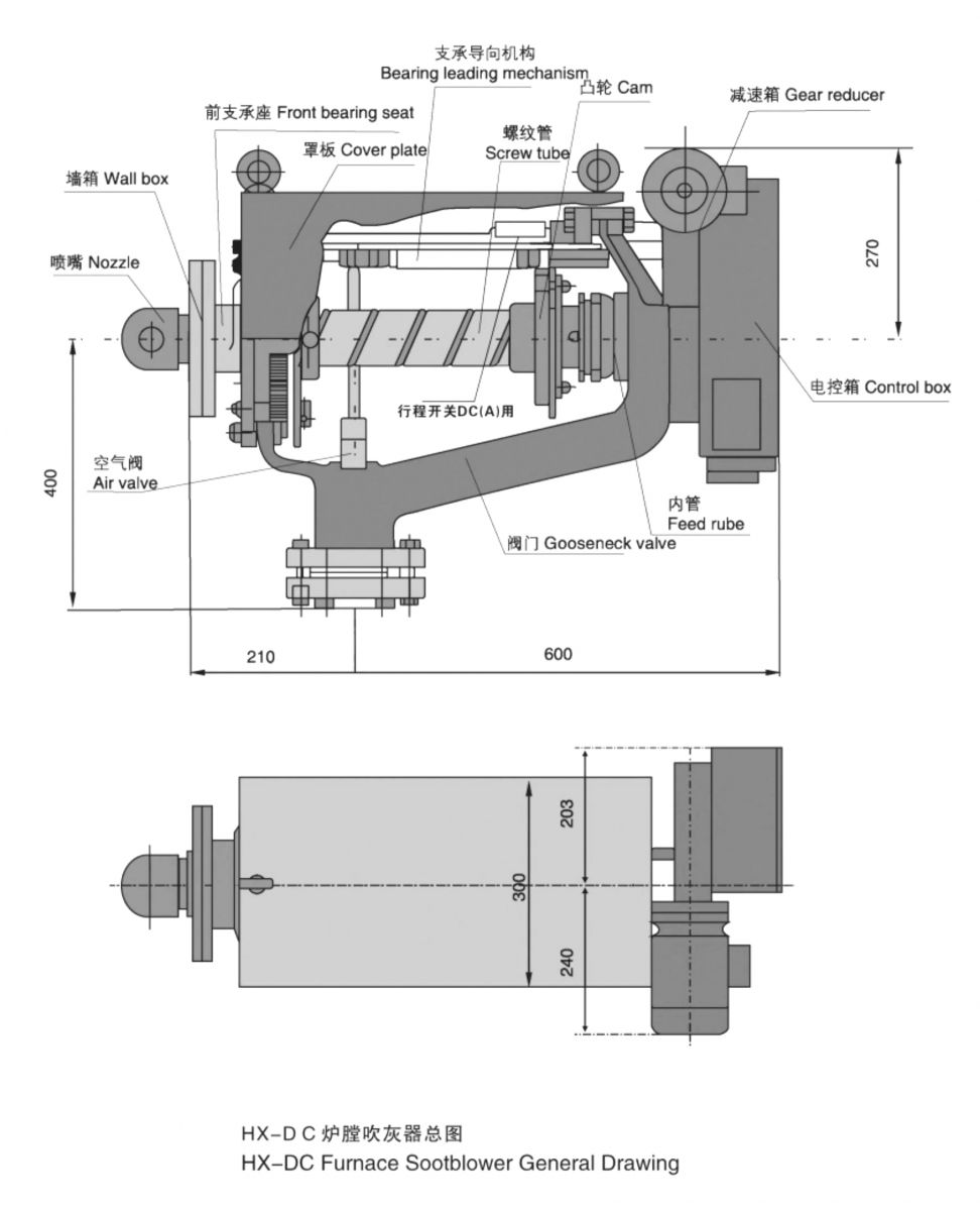 HX-DC吹灰器主要由鵝頸閥、內(nèi)管、吹灰槍與噴頭、減速傳動機構(gòu)、支承板、導向桿、電氣控制機構(gòu)、防護 罩組成。